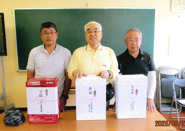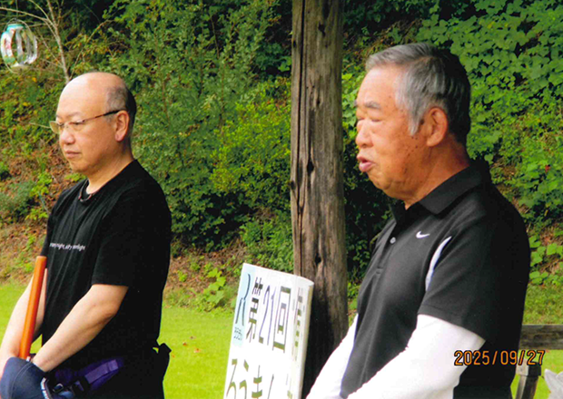 赤⇒青⇒赤と3コース24ホール、途中2回水分補給休憩を取りながら競技を行った。 時々ホールインワンが出たのか歓声が聞こえた。全班終了後、管理棟のミーティングルームに移動し、食源の里「祥華」の山菜おこわ弁当に参加者は舌鼓を打った。食べ終えてから成績発表と表彰を行った。