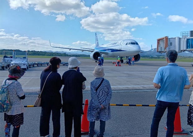 一行を乗せたバスは、途中、道の駅阿武町を経由して、見学先の益田市に向かって国道191号線を北上し、県境を越えて益田市に入る。まもなく一つ目の見学地である萩・石見空港に到着した。長門の出発時には、どんよりしていた空模様も、空港到着の頃には、雲一つない青空が広がる爽やかな秋晴れとなっていた。