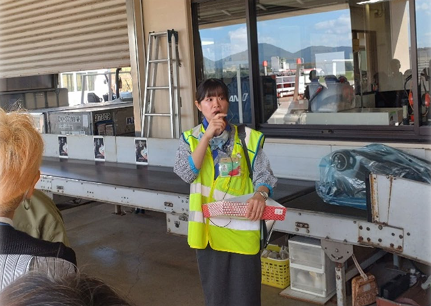 山頂を切り開いて造られた、広々とした滑走路と整備された芝生の緑が大変美しかった。普段立ち入ることのできない空港内のバックヤード見学をさせてもらった。地上業務の女性スタッフの方から、東京便の着陸から、出発に至るまでの業務を分かりやすく説明していただいた。到着から、折り返し便の離陸までの時間はわずか30分足らず。分刻みのいろんな業務をされているのに驚くと同時に、その手際よさに感動すら覚えた。各々持ち場で、最短時間での段取りが工夫され、その上で安心・安全な体制をとられていることが手に取るように実感できた。個人的に毎年この時期に開催されている「萩・石見空港マラソン」では、コースとして、滑走路内を走らせてもらっているが、レースでは滑走路上からの写真撮影はできないので、違う意味での感動を味わえた。東京行きの飛行機の離陸を見送り、空港を後にする。見学中、終始、笑顔を絶やさず案内していただいた地上スタッフの女性を始め、それぞれの作業動作が実にかっこいい空港職員の皆様、ありがとうございました。