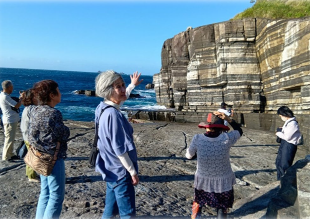 次に最後の見学地である須佐のホルンフェルスへ。現地までは、徒歩で10分足らず。激しい波しぶきと、白と黒のコントラストが見事な岩肌を目の前にすると、改めて自然の造形美に圧倒される。